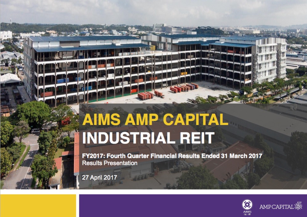 AIMS AMP Capital Industrial REIT Management Limited (the Manager) as manager of AIMS AMP Capital Industrial REIT (AA REIT) today announced the fourth quarter and full year financial results, which saw a 0.4 per cent quarter-on-quarter increase in Distribution Per Unit (DPU) to 2.78 cents for the quarter ended 31 March 2017.