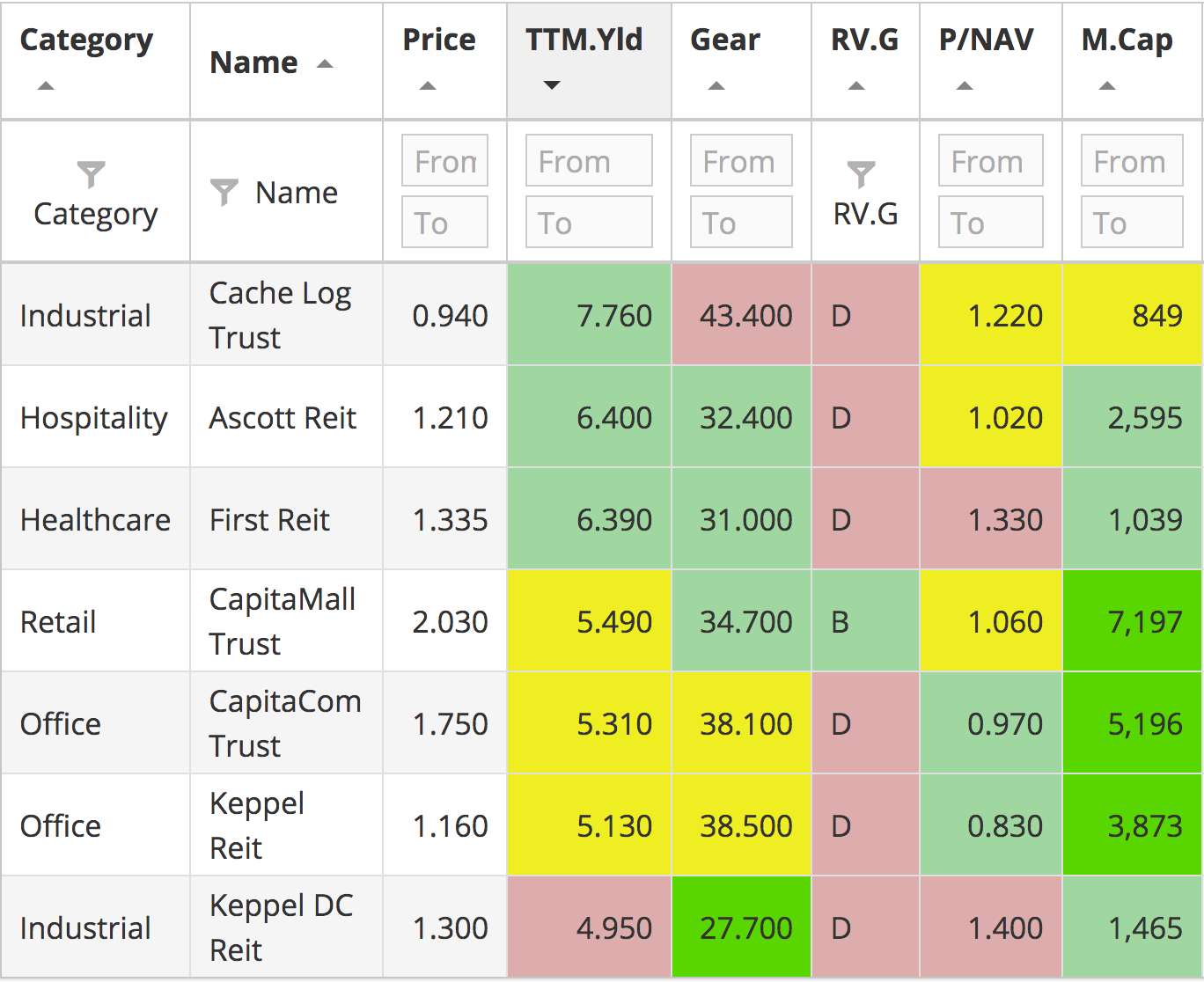 Here’s the latest comparison between these 7 REITs at close of 21 Jul 2017 (Source: YieldSavvy REITs screener)