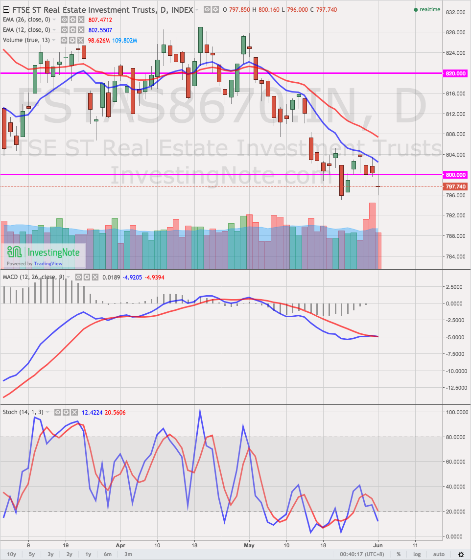 Singapore REITs market closed below 800 again this week; bearishness remains.