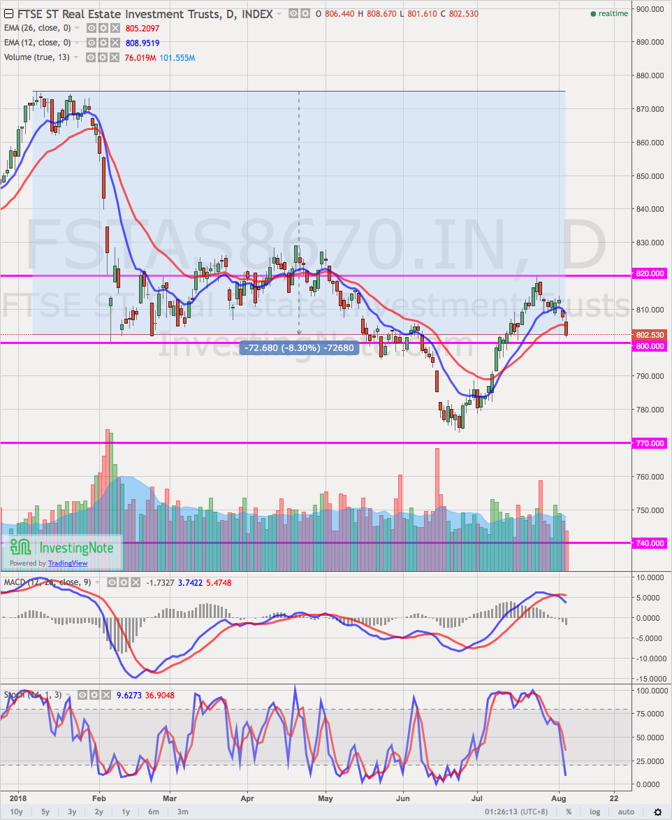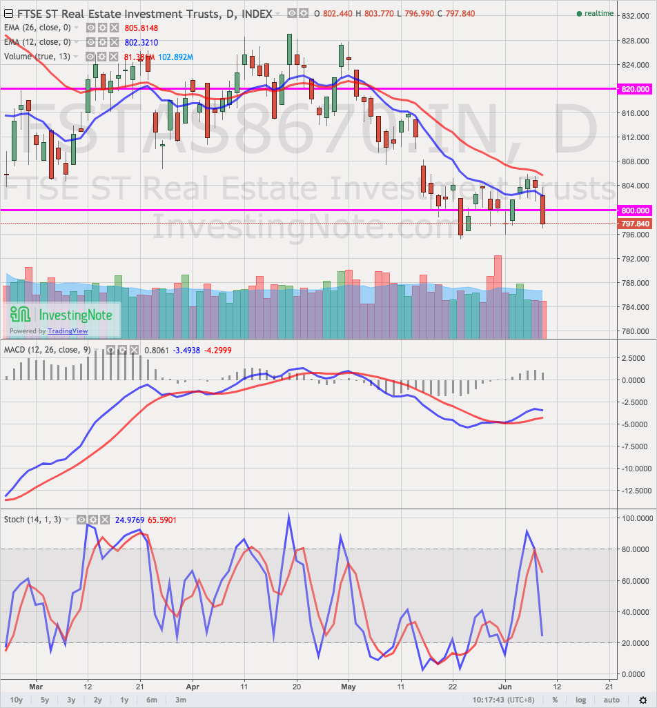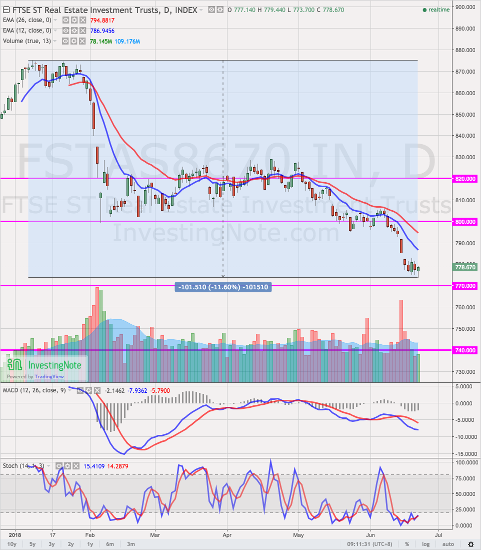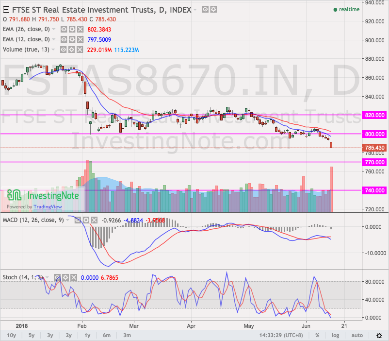 Singapore REITs index closed below 800 again this week (Week closing 8 Jun 2018)