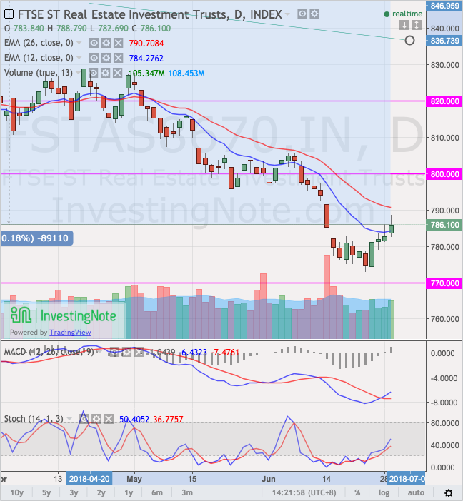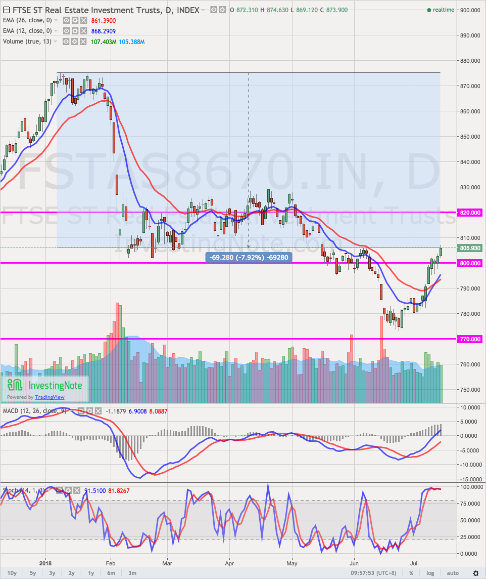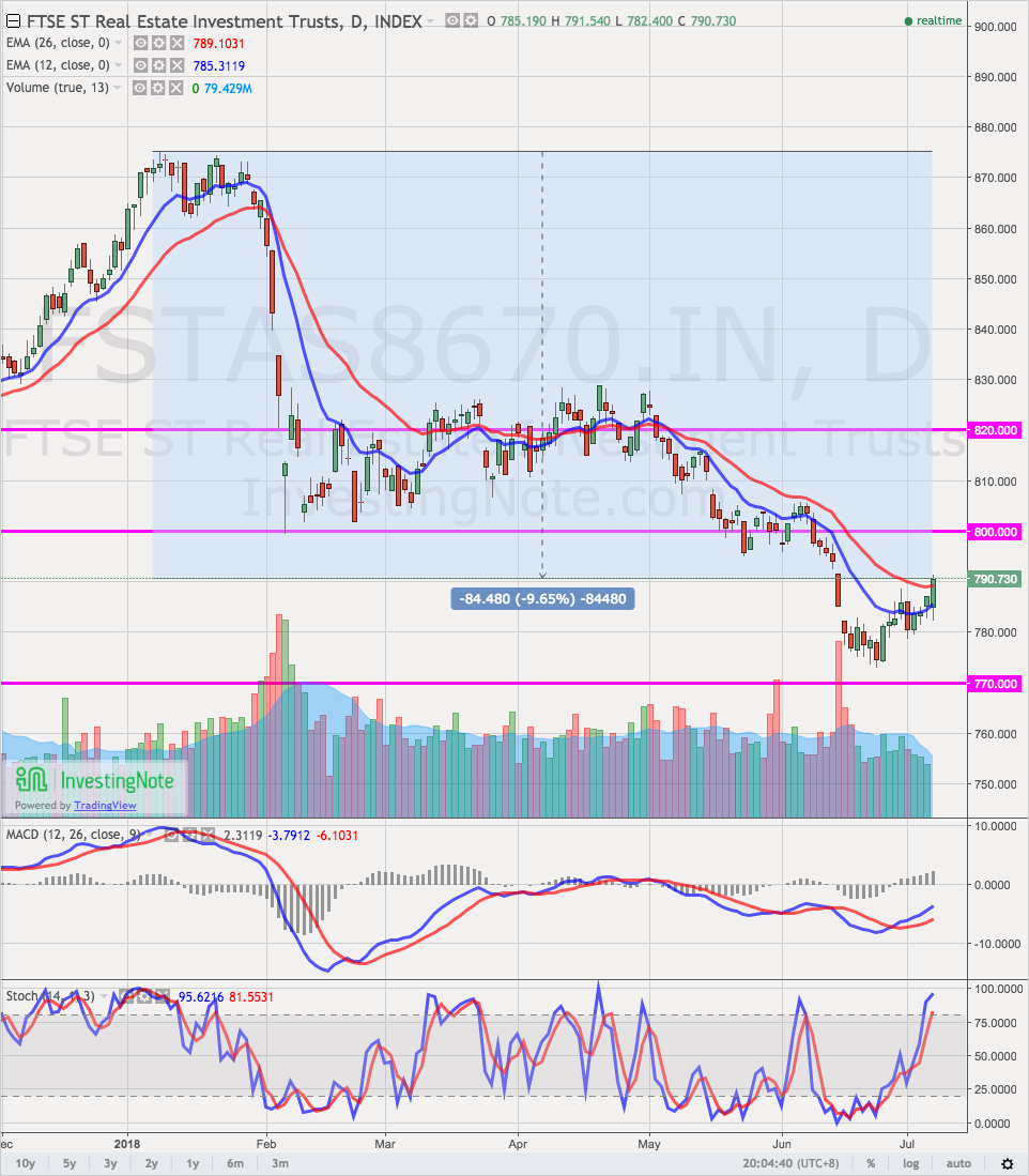 Singapore REITs market is heading towards 800 resistance level; closing this week above the high of the bullish engulfing pattern we saw last week; a bullish sign in the short term.