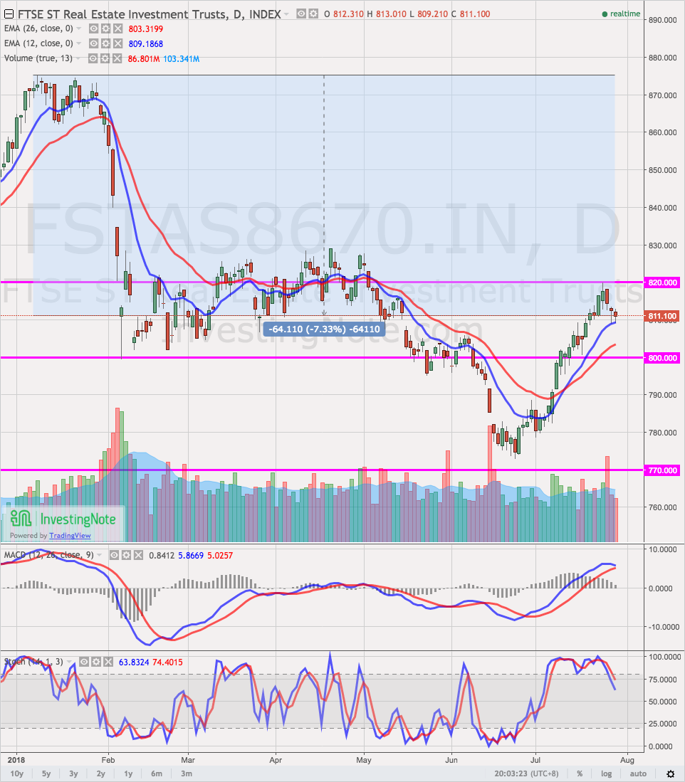 Singapore REITs market pulled back this week; short term uptrend blocked by 820 resistance.